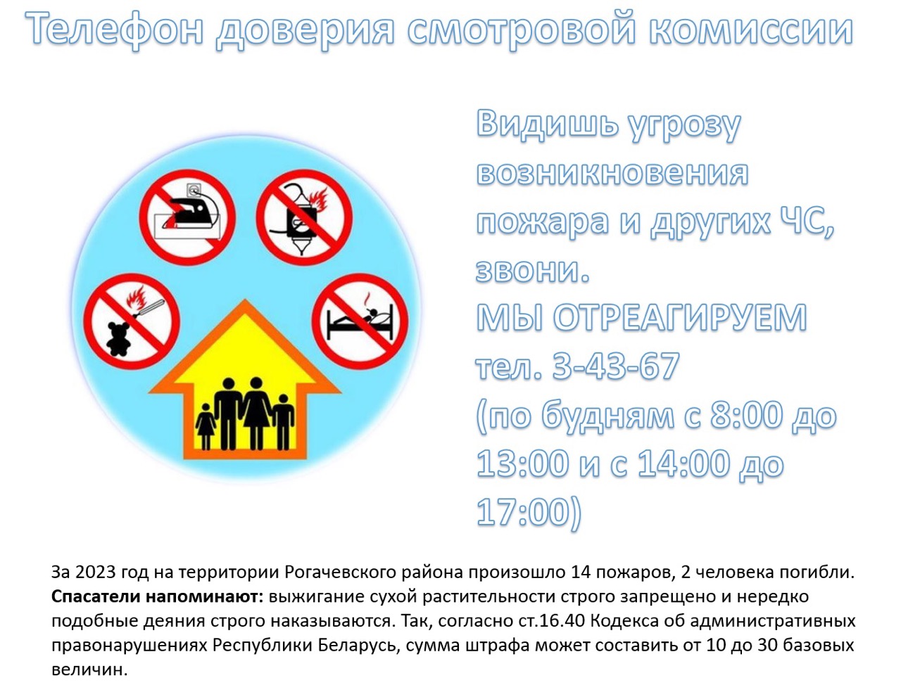 Уважаемые жители г.Рогачева, проведение противопожарного обследования ваших домовладений членами смотровых комиссий проводится ежегодно в ваших интересах! Просим вас не отказывать в допуске и не препятствовать проведению обследований. Следует помнить, что ваша безопасность в ваших руках!